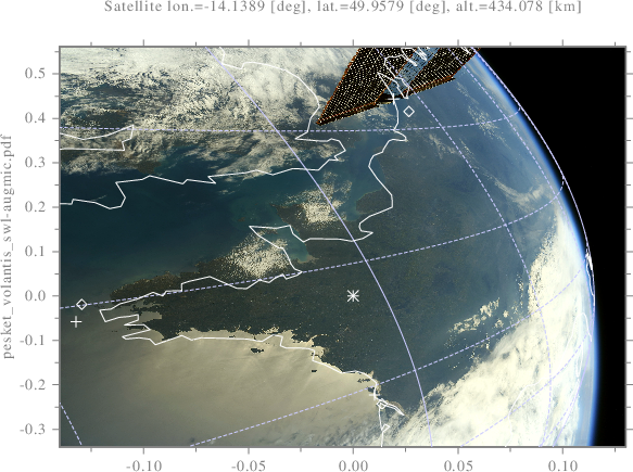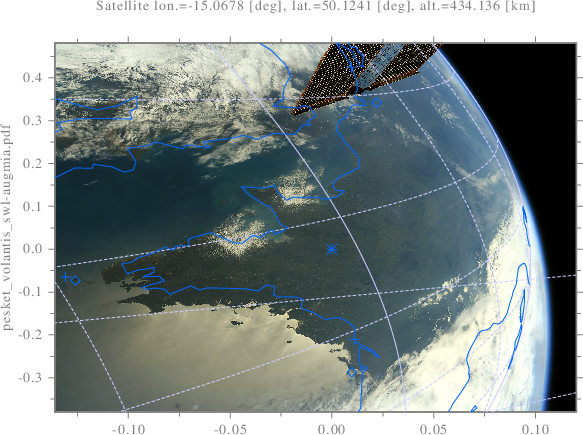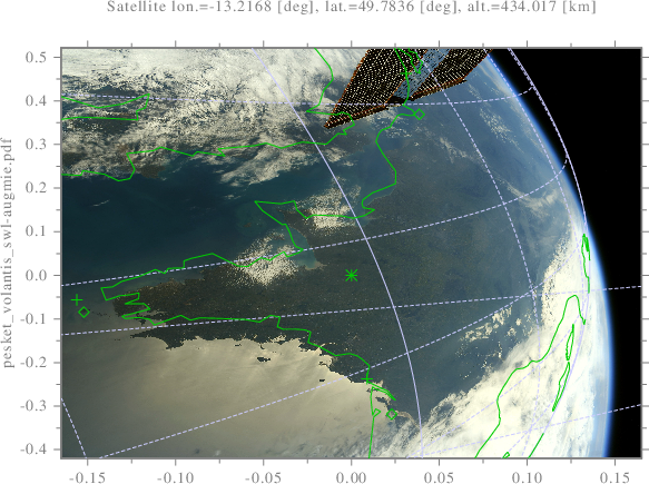 int pesket_volantis_swl(){ scltracefa(§, ƒ, ); scltracefc("scl-%s (%s) : %s\n\n", sclver(), sclsec(), temps_char(0)); // Position du 🐟 volant : 🛰 -> 🗺 double satlona_rad, satlata_rad, satalta_m; double satlonc_rad, satlatc_rad, sataltc_m; double satlone_rad, satlate_rad, satalte_m; orb_llac_swl("./don/trak/stations-21.05.05.tle", "ISS (ZARYA)", 2021, 4, 27, 9, 28, 23.0, 1, &satlona_rad, &satlata_rad, &satalta_m); orb_llac_swl("./don/trak/stations-21.05.05.tle", "ISS (ZARYA)", 2021, 4, 27, 9, 28, 33.0, 1, &satlonc_rad, &satlatc_rad, &sataltc_m); orb_llac_swl("./don/trak/stations-21.05.05.tle", "ISS (ZARYA)", 2021, 4, 27, 9, 28, 43.0, 1, &satlone_rad, &satlate_rad, &satalte_m); double satlona_deg, satlata_deg, satalta_km; double satlonc_deg, satlatc_deg, sataltc_km; double satlone_deg, satlate_deg, satalte_km; satlona_deg=satlona_rad/π*180; satlata_deg=satlata_rad/π*180; satlonc_deg=satlonc_rad/π*180; satlatc_deg=satlatc_rad/π*180; satlone_deg=satlone_rad/π*180; satlate_deg=satlate_rad/π*180; satalta_km = satalta_m/103; sataltc_km = sataltc_m/103; satalte_km = satalte_m/103; double ctrlon_deg=-0.73, ctrlon_rad=ctrlon_deg/180*π; double ctrlat_deg=/*48.78*/48.0, ctrlat_rad=ctrlat_deg/180*π; double ctralt_m=0; double ctrphia_deg=-45, ctrphia_rad=ctrphia_deg/180*π; double ctrphic_deg=-45, ctrphic_rad=ctrphic_deg/180*π; double ctrphie_deg=-45, ctrphie_rad=ctrphie_deg/180*π; int visn = 1001; double *lonvisa=new double[visn], *latvisa=new double[visn]; double *lonvisc=new double[visn], *latvisc=new double[visn]; double *lonvise=new double[visn], *latvise=new double[visn]; covisible(satlona_rad, satlata_rad, satalta_m, visn, lonvisa, latvisa); covisible(satlonc_rad, satlatc_rad, sataltc_m, visn, lonvisc, latvisc); covisible(satlone_rad, satlate_rad, satalte_m, visn, lonvise, latvise); double *altvis=newtab<double>(visn, 0); rad_deg(visn, lonvisa, lonvisa); rad_deg(visn, latvisa, latvisa); rad_deg(visn, lonvisc, lonvisc); rad_deg(visn, latvisc, latvisc); rad_deg(visn, lonvise, lonvise); rad_deg(visn, latvise, latvise); scl::string_c imgname=scl::string_c(ƒ)+".svg", imgpath="./srt/"+imgname; scl::string_c legend = "Sat. lon.=" + num_str<double>(satlona_deg) + " [deg], lat.=" + num_str<double>(satlata_deg) + " [deg], alt.=" + num_str<double>(satalta_km) + " [km];"; legend += ";Sat. lon.=" + num_str<double>(satlonc_deg) + " [deg], lat.=" + num_str<double>(satlatc_deg) + " [deg], alt.=" + num_str<double>(sataltc_km) + " [km];"; legend += ";Sat. lon.=" + num_str<double>(satlone_deg) + " [deg], lat.=" + num_str<double>(satlate_deg) + " [deg], alt.=" + num_str<double>(satalte_km) + " [km];"; graf_dis(imgpath.c_str(), 1, &satlona_deg, &satlata_deg, "curve", visn, lonvisa, latvisa, "curve", 1, &satlonc_deg, &satlatc_deg, "curve", visn, lonvisc, latvisc, "curve", 1, &satlone_deg, &satlate_deg, "curve", visn, lonvise, latvise, "geographic", "flat", "linespec", "l*;-l;w*;-w;t*;-t", "linespecw", "-p", "ylabel", imgname.c_str(), "legend", legend.c_str(), "legcorn", "ulp", "linespeca", "-a", ); //--------------------------------------------------------------------- int *stena=new int[visn], *stenc=new int[visn], *stene=new int[visn]; double *xa_imsg=new double[visn], *ya_imsg=new double[visn]; double *xc_imsg=new double[visn], *yc_imsg=new double[visn]; double *xe_imsg=new double[visn], *ye_imsg=new double[visn]; llag_imsg(visn, lonvisa, latvisa, altvis, satlona_rad, satlata_rad, satalta_m, ctrlon_rad, ctrlat_rad, ctralt_m, ctrphia_rad, stena, xa_imsg, ya_imsg); llag_imsg(visn, lonvisc, latvisc, altvis, satlonc_rad, satlatc_rad, sataltc_m, ctrlon_rad, ctrlat_rad, ctralt_m, ctrphic_rad, stenc, xc_imsg, yc_imsg); llag_imsg(visn, lonvise, latvise, altvis, satlone_rad, satlate_rad, satalte_m, ctrlon_rad, ctrlat_rad, ctralt_m, ctrphie_rad, stene, xe_imsg, ye_imsg); double xaa=min<double>(visn, xa_imsg/*, stena*/), xea=max<double>(visn, xa_imsg/*, stena*/); double xac=min<double>(visn, xc_imsg/*, stenc*/), xec=max<double>(visn, xc_imsg/*, stenc*/); double xae=min<double>(visn, xe_imsg/*, stene*/), xee=max<double>(visn, xe_imsg/*, stene*/); double yaa=min<double>(visn, ya_imsg/*, stena*/), yea=max<double>(visn, ya_imsg/*, stena*/); double yac=min<double>(visn, yc_imsg/*, stenc*/), yec=max<double>(visn, yc_imsg/*, stenc*/); double yae=min<double>(visn, ye_imsg/*, stene*/), yee=max<double>(visn, ye_imsg/*, stene*/); double cxe = /*xea*/xec; xea=1.08*cxe; xaa=-xea; yaa=-cxe*3.08; yea=-yaa; cxe = xec; xec=1.08*cxe; xac=-xec; yac=-cxe*3.08; yec=-yac; cxe = xee/*xec*/; xee=1.00*cxe; xae=-xee; yae=-cxe*2.08; yee=-yae; double clon=-5.9/180*π, clat=48.0/180*π, cx, cy; int cin; double calt=0; llag_imsg(1, &clon, &clat, altvis, satlona_rad, satlata_rad, satalta_m, ctrlon_rad, ctrlat_rad, ctralt_m, ctrphia_rad, &cin, &cx, &cy); xaa=cx; xea=-xaa; llag_imsg(1, &clon, &clat, altvis, satlonc_rad, satlatc_rad, sataltc_m, ctrlon_rad, ctrlat_rad, ctralt_m, ctrphic_rad, &cin, &cx, &cy); xac=cx; xec=-xac; llag_imsg(1, &clon, &clat, altvis, satlone_rad, satlate_rad, satalte_m, ctrlon_rad, ctrlat_rad, ctralt_m, ctrphie_rad, &cin, &cx, &cy); xae=cx; xee=-xae; clon=-1.5/180*π; clat=44.5/180*π; llag_imsg(1, &clon, &clat, altvis, satlona_rad, satlata_rad, satalta_m, ctrlon_rad, ctrlat_rad, ctralt_m, ctrphia_rad, &cin, &cx, &cy); yaa=cy; yea=-yaa; llag_imsg(1, &clon, &clat, altvis, satlonc_rad, satlatc_rad, sataltc_m, ctrlon_rad, ctrlat_rad, ctralt_m, ctrphic_rad, &cin, &cx, &cy); yac=cy; yec=-yac; llag_imsg(1, &clon, &clat, altvis, satlone_rad, satlate_rad, satalte_m, ctrlon_rad, ctrlat_rad, ctralt_m, ctrphie_rad, &cin, &cx, &cy); yae=cy; yee=-yae; // Marqueurs double corzlon_deg=-5.093722787427713, corzlat_deg=48.45161774120933; clon=corzlon_deg/180*π; clat=corzlat_deg/180*π; calt=0; llag_imsg(1, &clon, &clat, &calt, satlonc_rad, satlata_rad, satalta_m, ctrlon_rad, ctrlat_rad, ctralt_m, ctrphia_rad, &cin, &cx, &cy); double corzxa_imsg=cx, corzya_imsg=cy; llag_imsg(1, &clon, &clat, &calt, satlonc_rad, satlatc_rad, sat